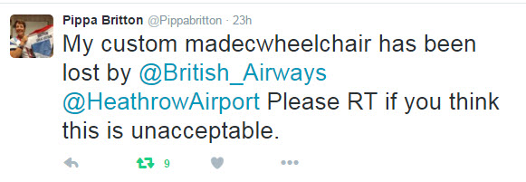 Arriving at London Heathrow airport, Pippa Britton was told her bespoke wheelchair was nowhere to be found. British Airways staff told the Paralympian they were doing their “level best” to find it.