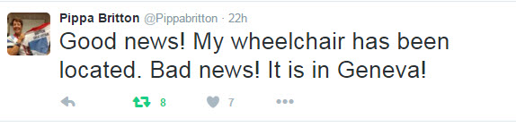 Within an hour, she twitted her wheelchair had been found in Switzerland, as it had been placed on board the wrong airplane.